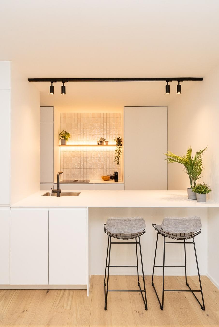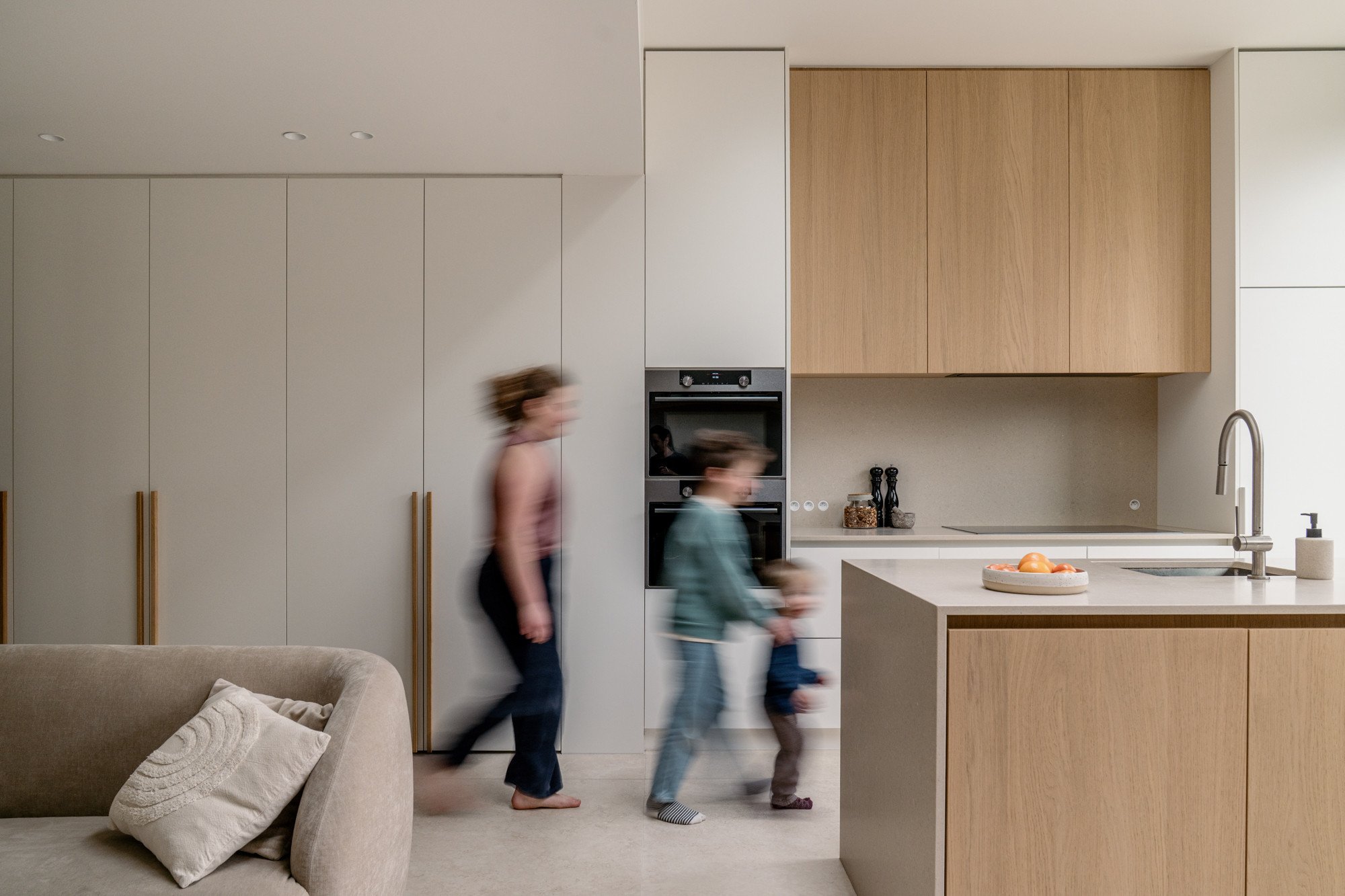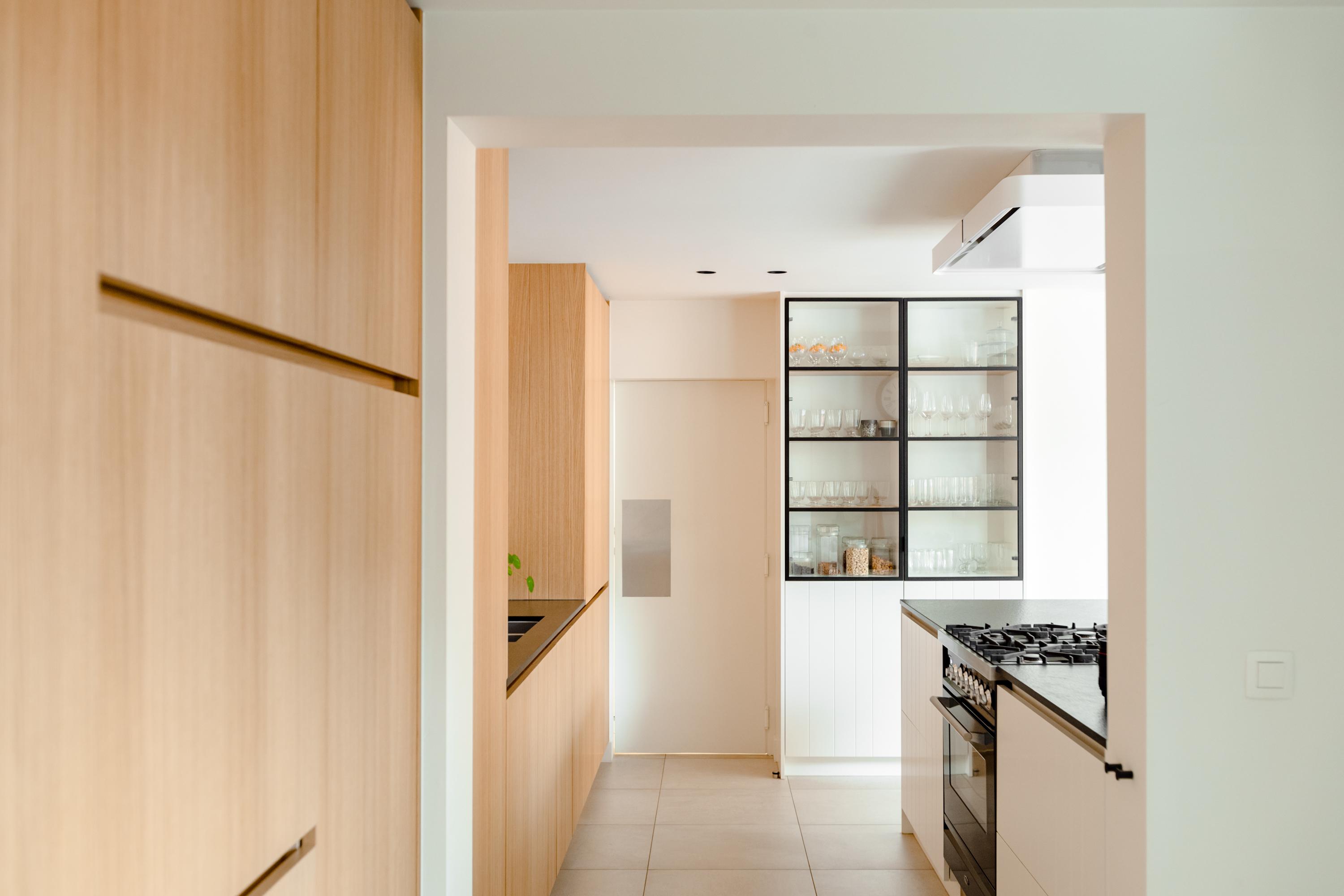 Het interieur werd volledig op maat uitgewerkt, met een sterke focus op verfijning en samenhang. We ontwierpen exclusieve handgrepen die speciaal voor dit project werden vervaardigd. Het doorgedreven concept van donkere bronzen accenten keert subtiel terug in de verlichting, deurkrukken en zelfs in de accessoires van het gastentoilet — een lijn die het geheel rust en karakter geeft.