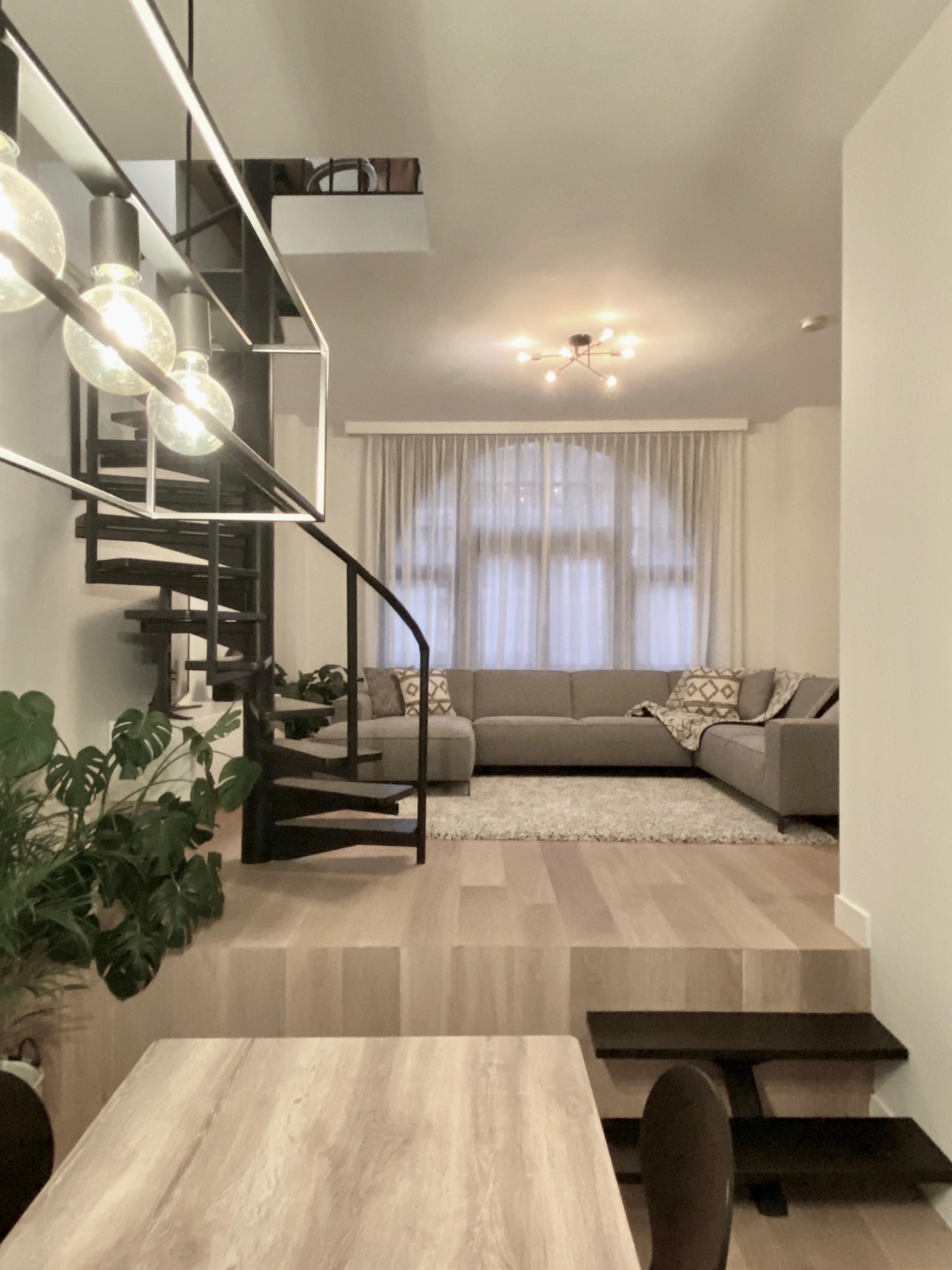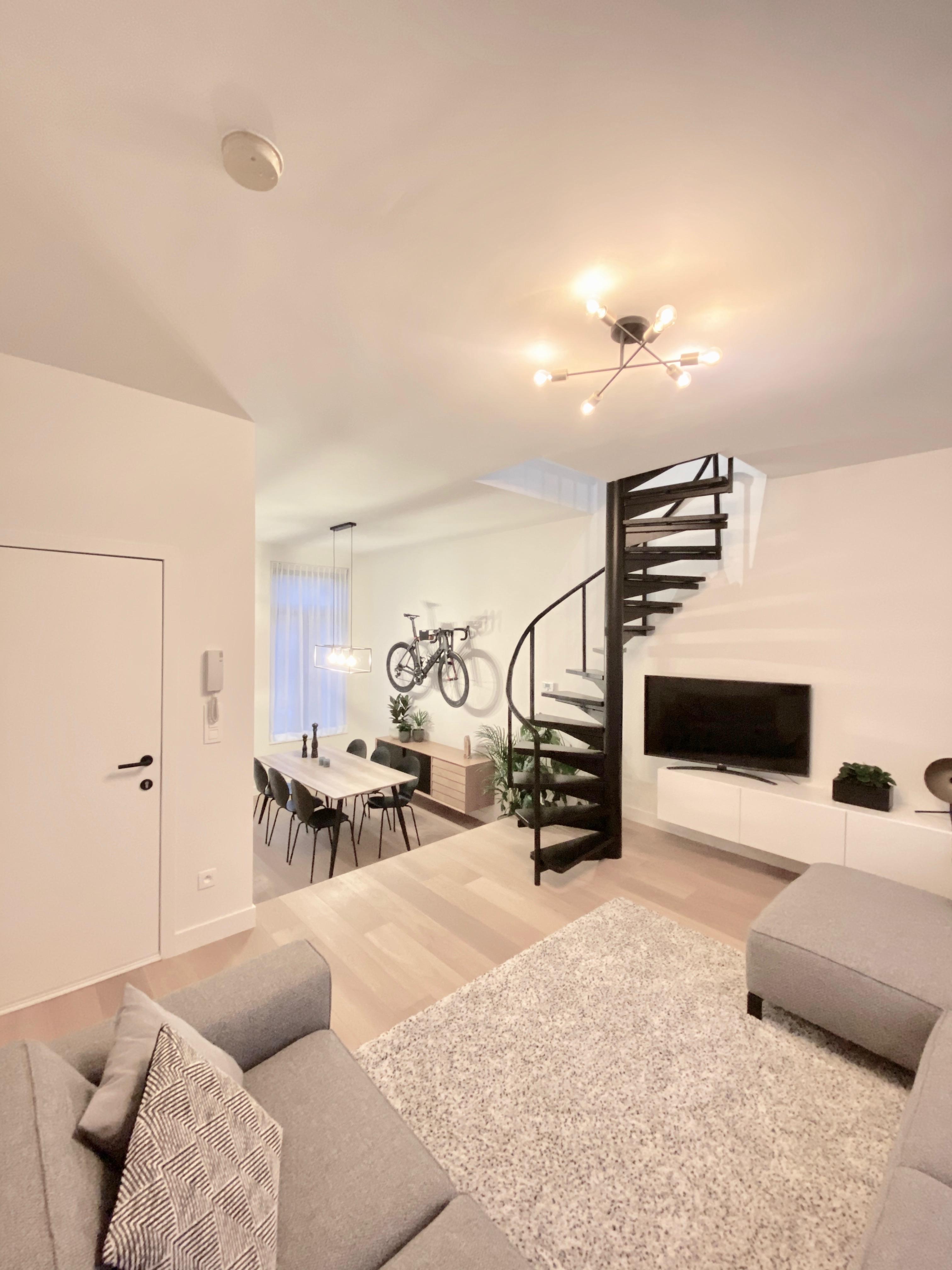 Een fiets tegen de muur? Dit moet allicht de bekendste woonkamer van Vlaanderen zijn nadat deze foto viraal ging op de sociale media. Nabij het bruisende Antwerpen-Zuid renoveerden we een hip duplex appartement voor een jonge fietsliefhebber. Een leuke combinatie van materialen, splinternieuwe badkamer en warme parketvloeren zorgen voor een ideale warme thuis.