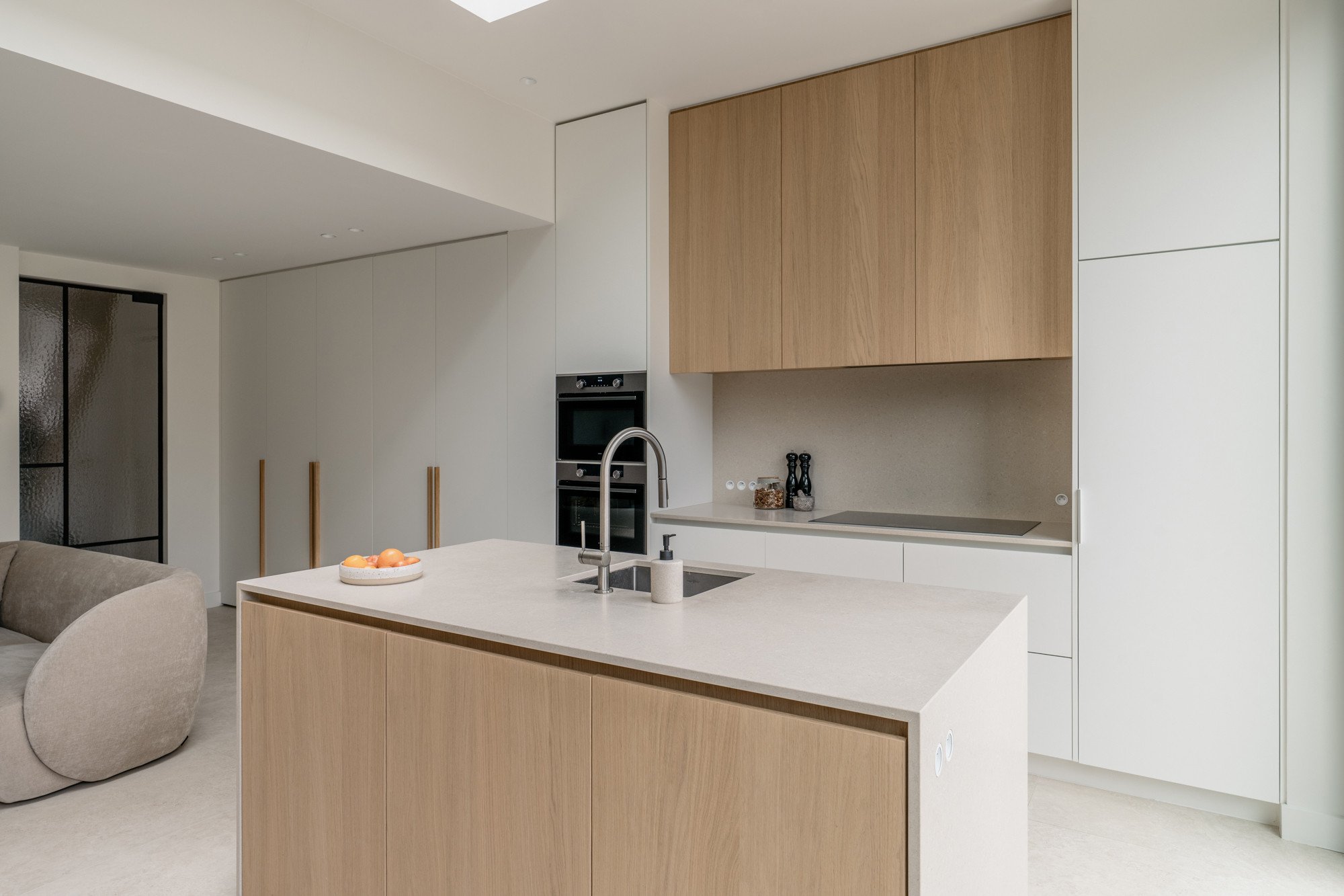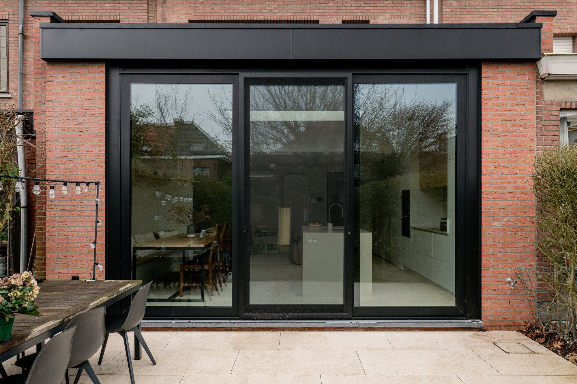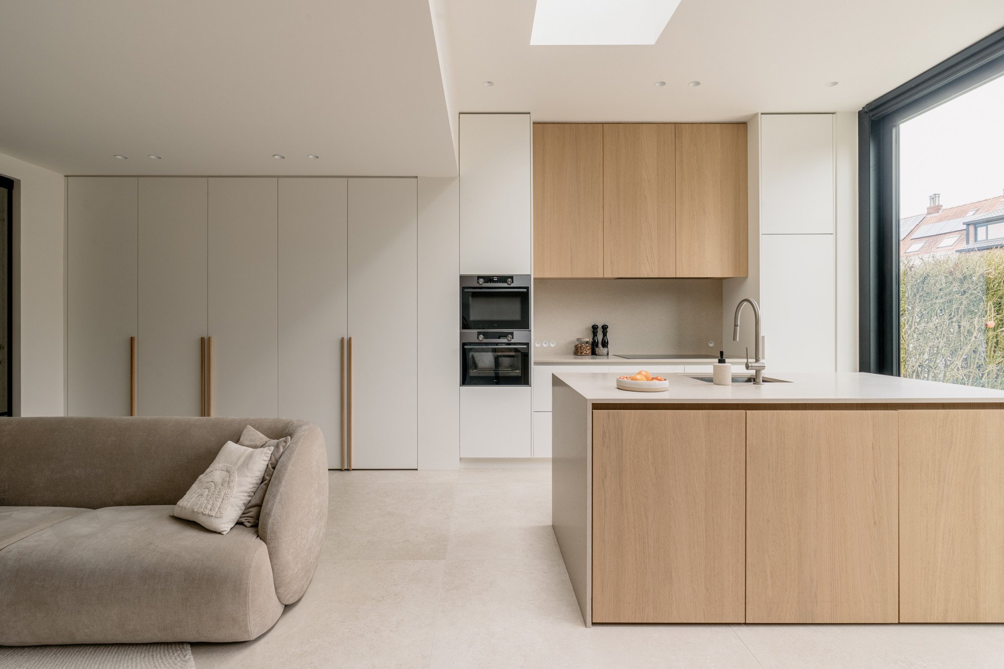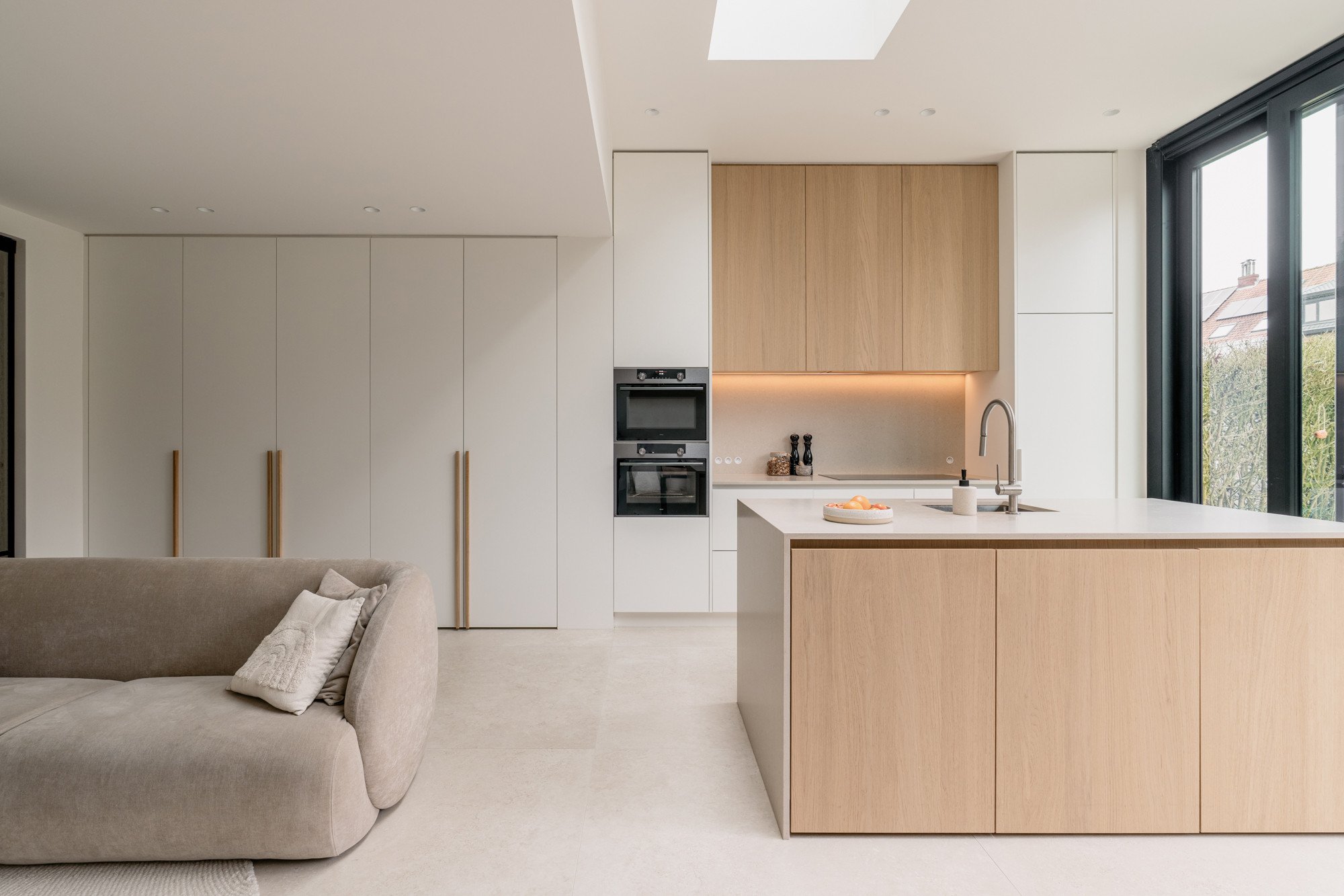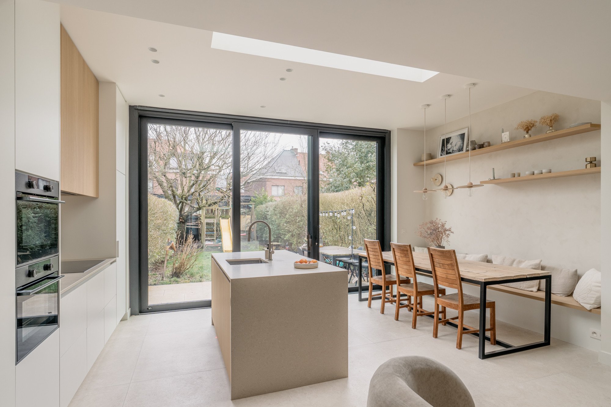 Deze bel-etage woning, oorspronkelijk voorzien van een oude veranda, kreeg een volledige make-over met een uitbouw en een compleet nieuw gelijkvloers. Door het plafond tot 3 meter te verhogen, ontstaat een gevoel van openheid en ruimte. Een strategisch geplaatste dakkoepel laat het daglicht doorstromen, waardoor de hele woonkamer baadt in natuurlijk licht. Lichte kleuren in het interieur zorgen voor rust en sereniteit te midden van de hectiek van een gezin. Het resultaat is een woning die precies aansluit bij de wensen van de bewoners, een woning die niet op de markt te vinden was.