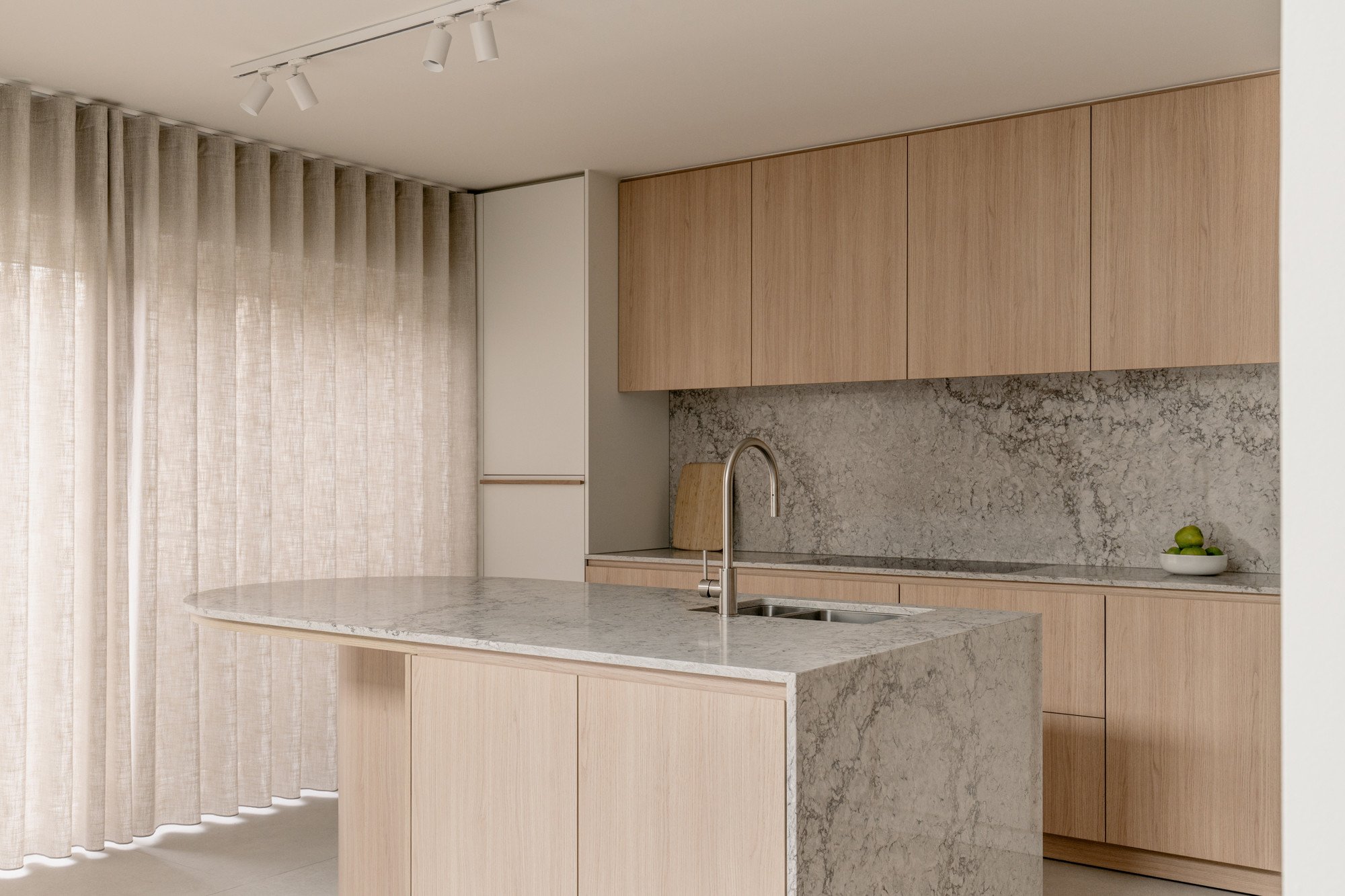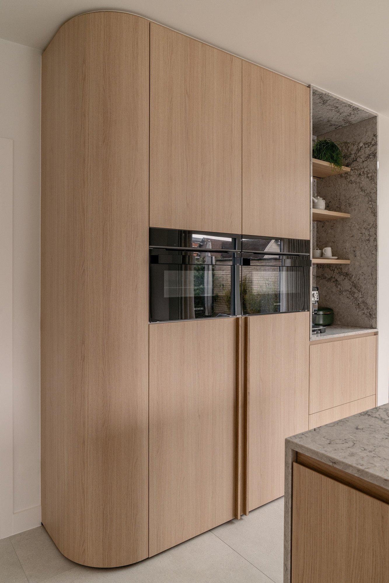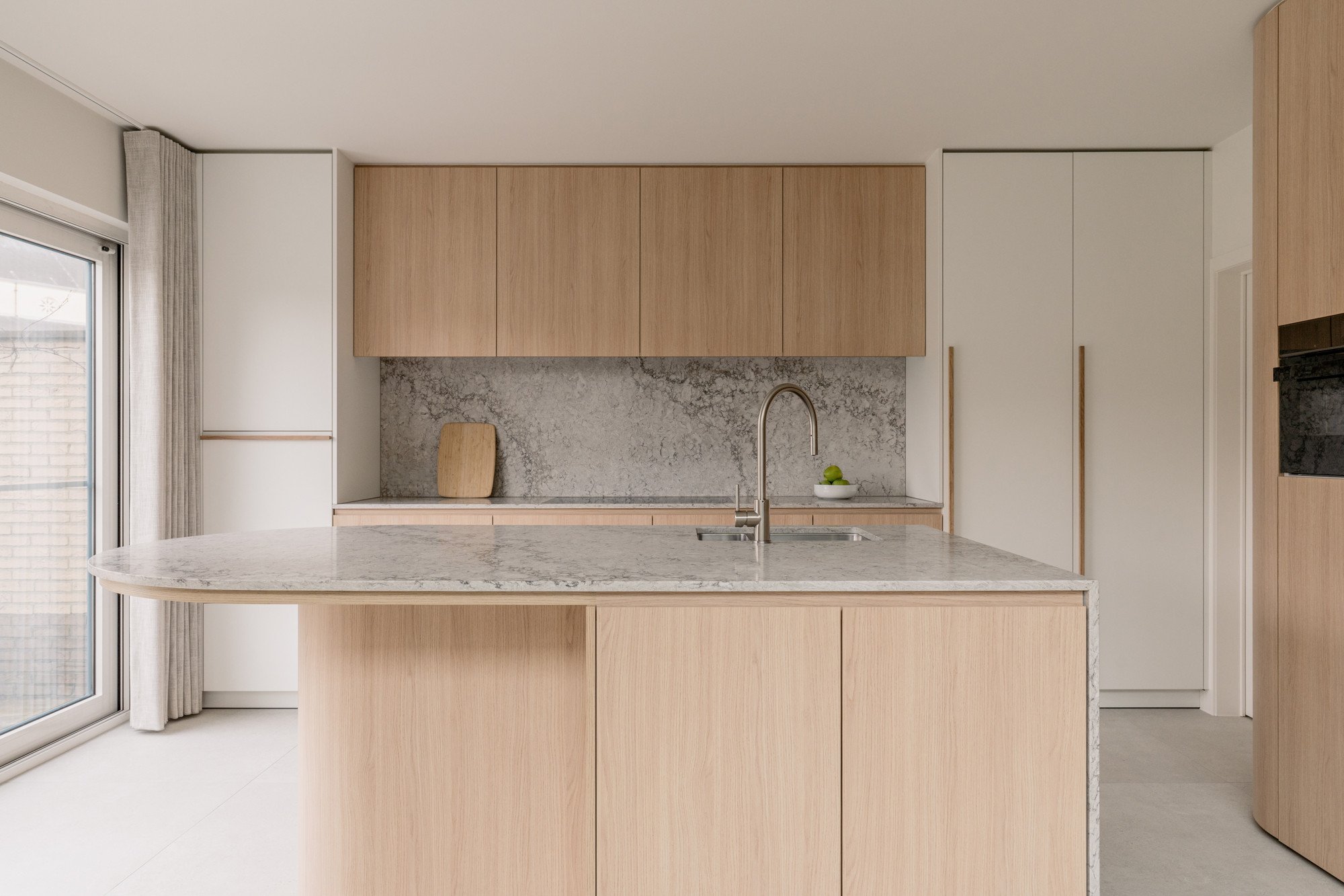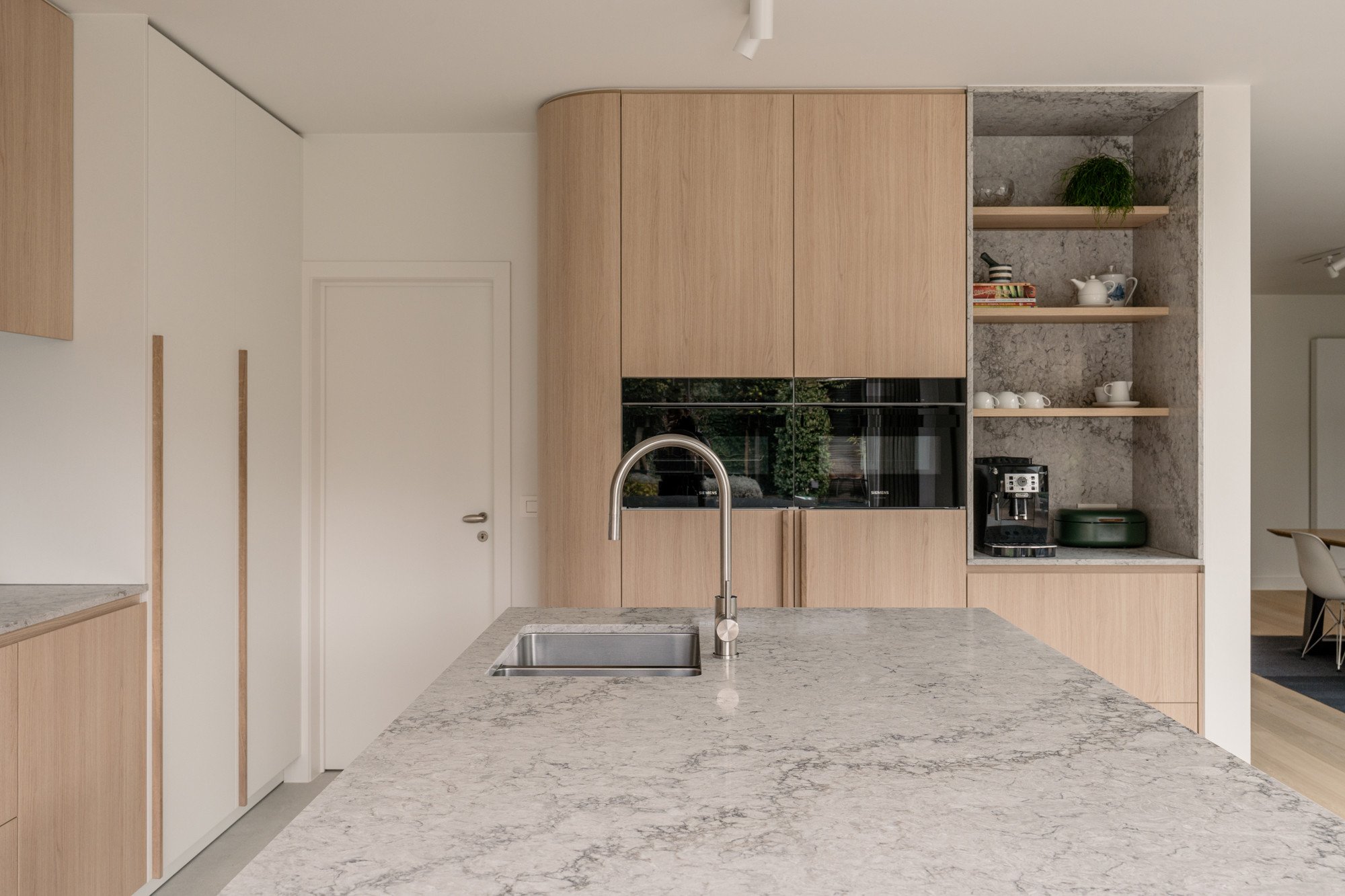 Ronde vormen zorgen voor zachte overgangen tussen de verschillende zones, terwijl een subtiele toets van groen in de stalen deur en de barretjes van de kasten een verrassend accent geeft. Maatwerk in zowel de keuken als de woonkamer zorgt voor een harmonieus en persoonlijk interieur.