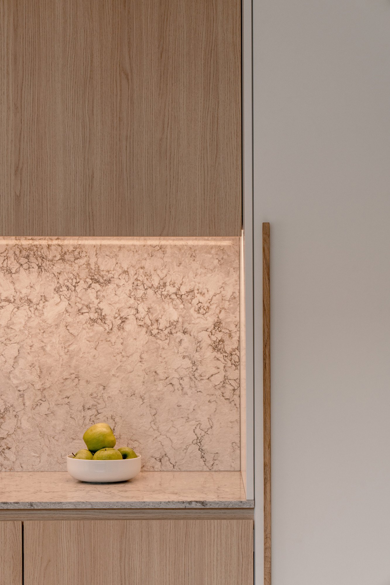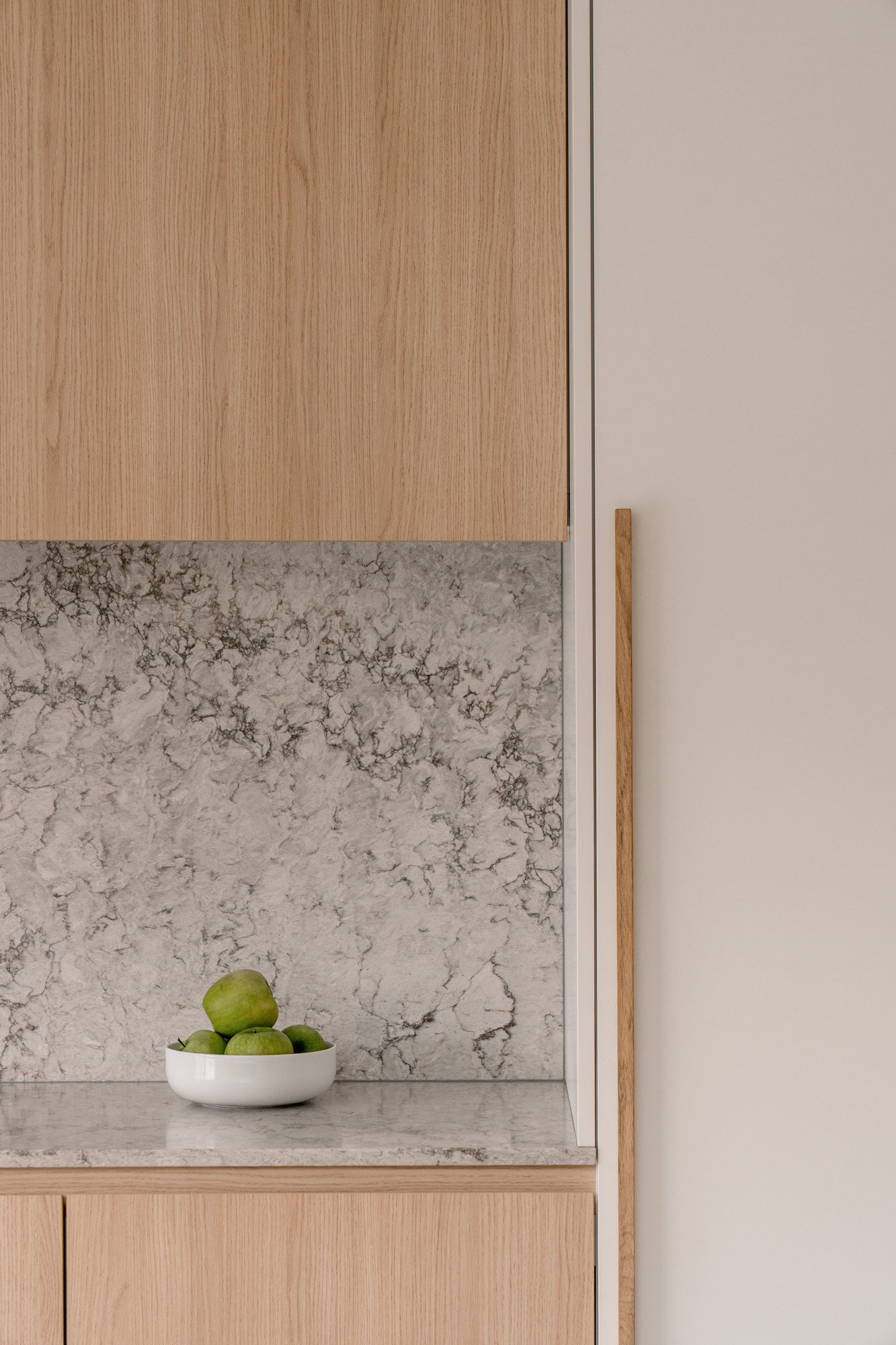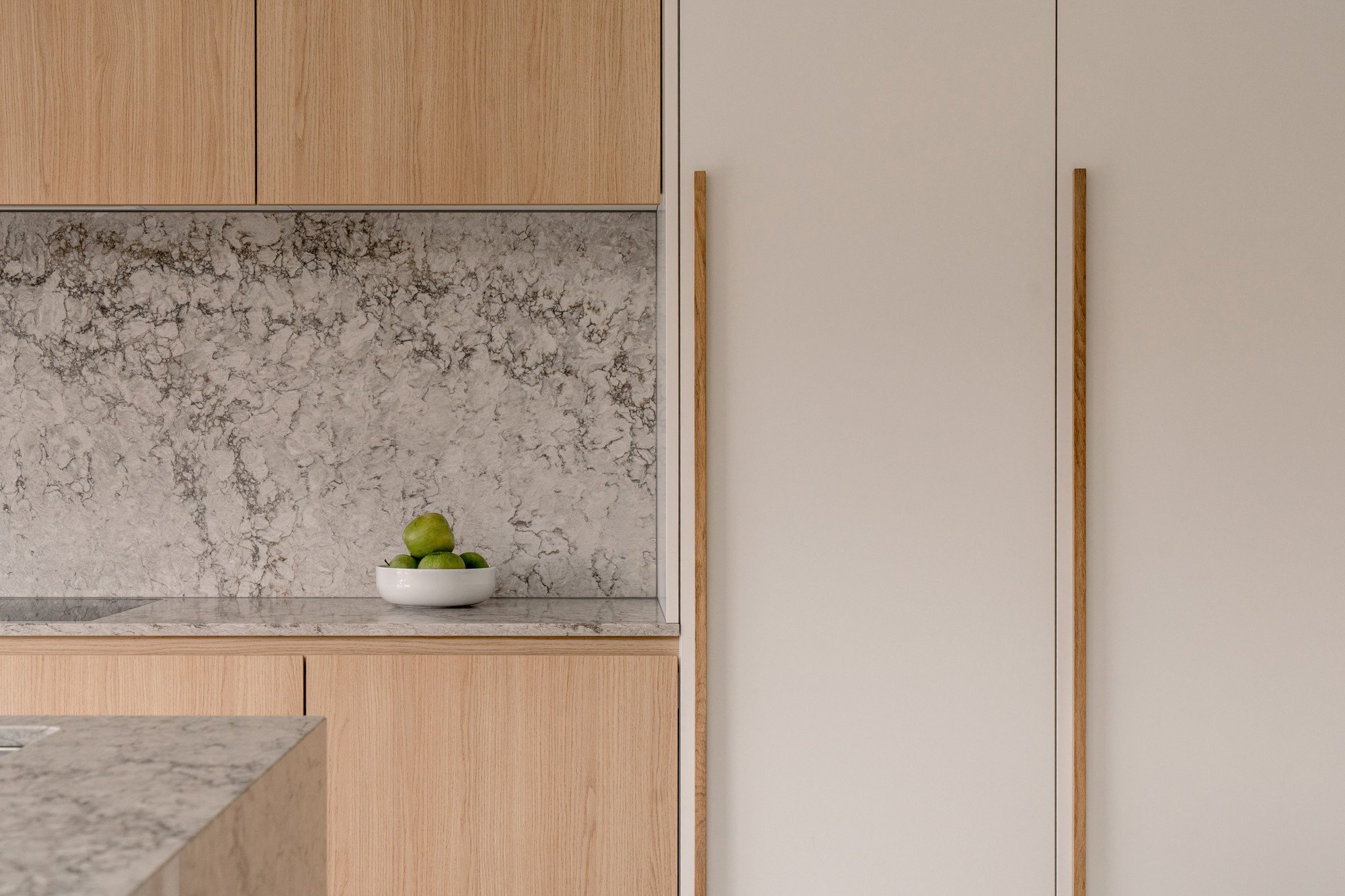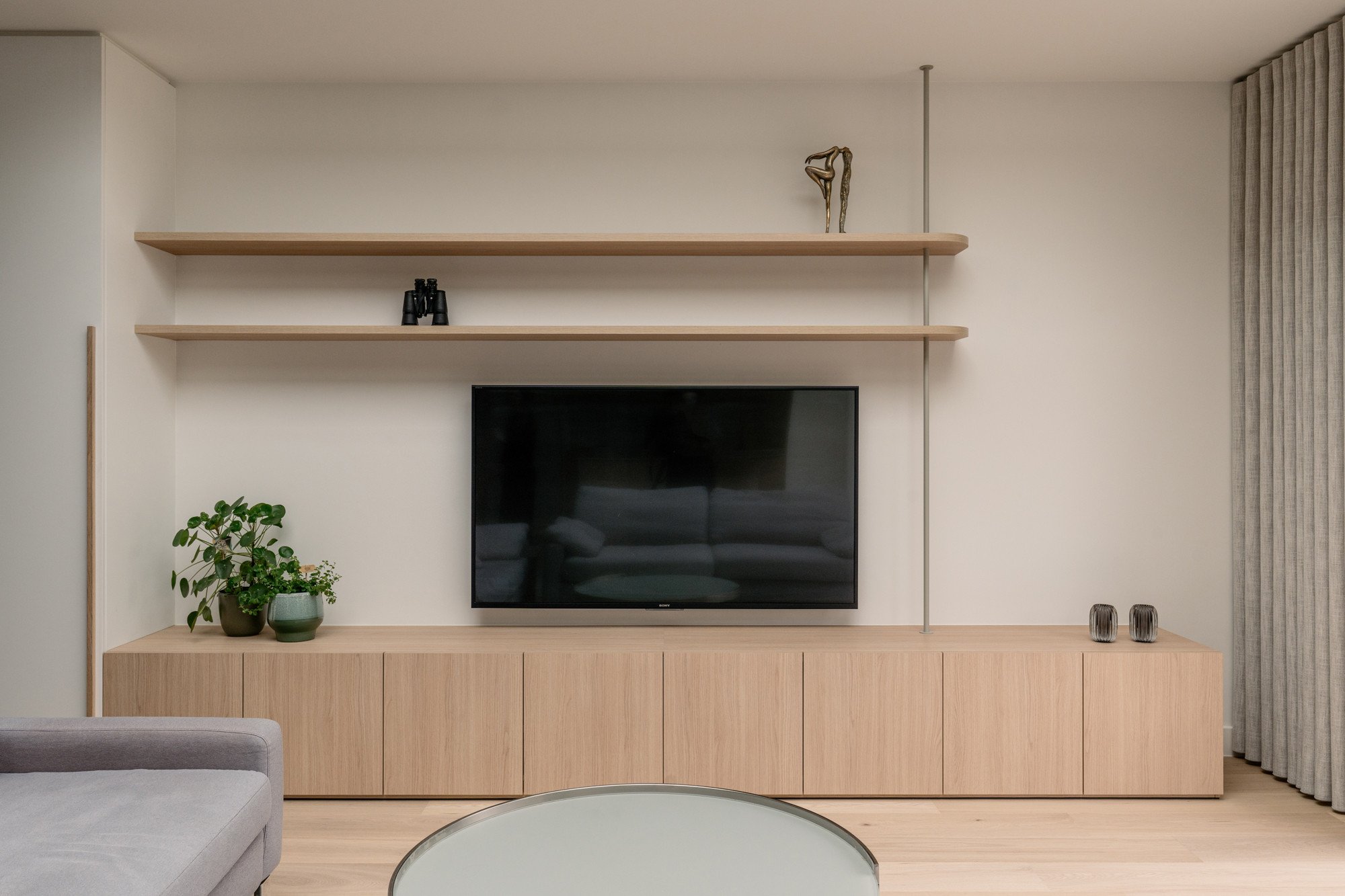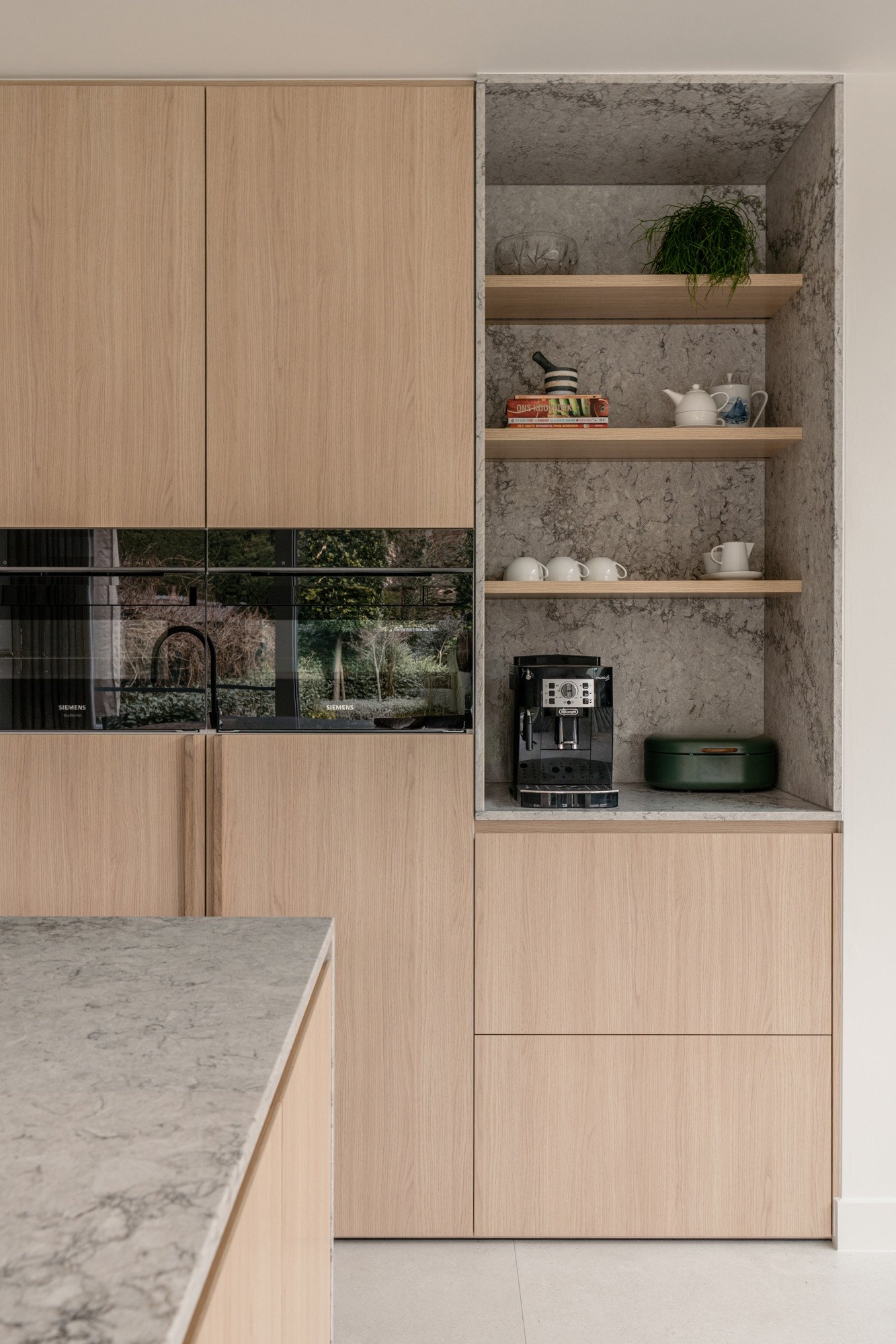 Ronde vormen zorgen voor zachte overgangen tussen de verschillende zones, terwijl een subtiele toets van groen in de stalen deur en de barretjes van de kasten een verrassend accent geeft. Maatwerk in zowel de keuken als de woonkamer zorgt voor een harmonieus en persoonlijk interieur.
