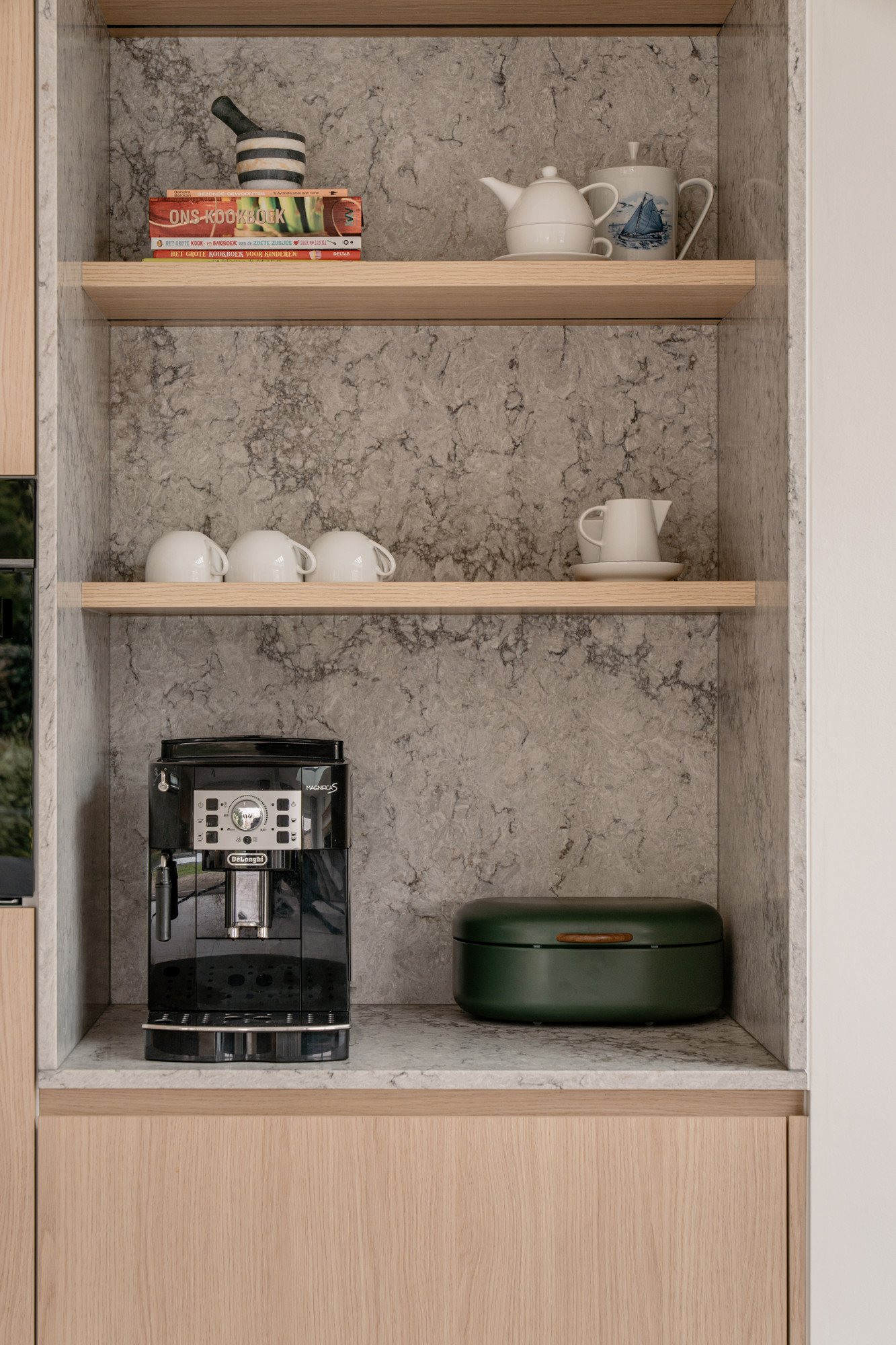 Een echte blikvanger is het composiet werkblad van de keuken dat ook terugkomt in de gezellige ontbijt/koffienis. Deze wordt perfect uitgelicht met sfeervolle verlichting in de schabben, zodat dit hoekje uitnodigt tot ontspannen momenten en fijne ontmoetingen.